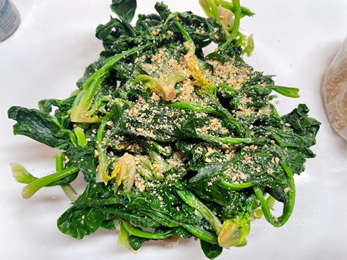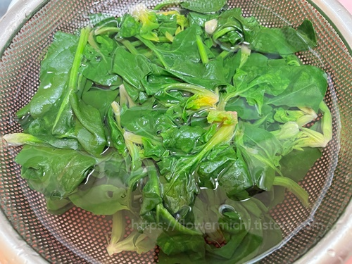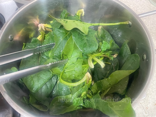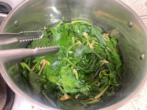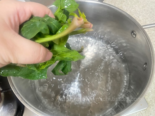이때부터 고민이 시작됩니다. 과연 언제 꺼내야 하는가! 시금치는 조금 일찍 꺼내면 너무 뻣뻣하고, 너무 늦게 꺼내면 흐물거려요. 검색해보면 30초에서 1분 사이라고 하는데 사실 30초 차이가 꽤 크거든요.