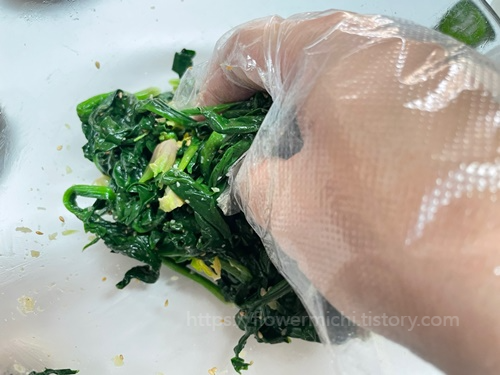 좀 전에 꾹꾹 물기를 뺀 시금치 나물에 간마늘, 소금, 참기름, 깨소금으로 간을 맞춰 주세요. 간마늘은 반 스푼 정도 넣고, 나머지는 조금씩 넣으면서 간을 맞춰 주세요. 먹었을 때 뭔가 부족하다 싶으면 조미료를 살짝 첨가해주셔도 됩니다. 저는 다시다를 살짝 뿌려줬어요. 그리고 참기름을 넉넉히 넣는 게 맛있더라고요.