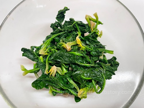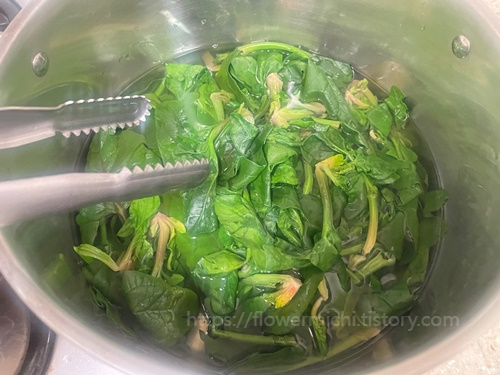 이때부터 고민이 시작됩니다. 과연 언제 꺼내야 하는가! 시금치는 조금 일찍 꺼내면 너무 뻣뻣하고, 너무 늦게 꺼내면 흐물거려요. 검색해보면 30초에서 1분 사이라고 하는데 사실 30초 차이가 꽤 크거든요.