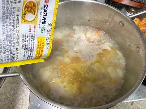 재료가 다 익었다 싶을 때 불을 약하게 줄이고 카레 가루를 조금씩 부으면서 휘저어주세요.