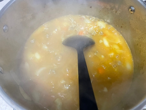 카레 가루가 다 녹은 뒤에 카레가 너무 묽지 않은지 봐주세요.