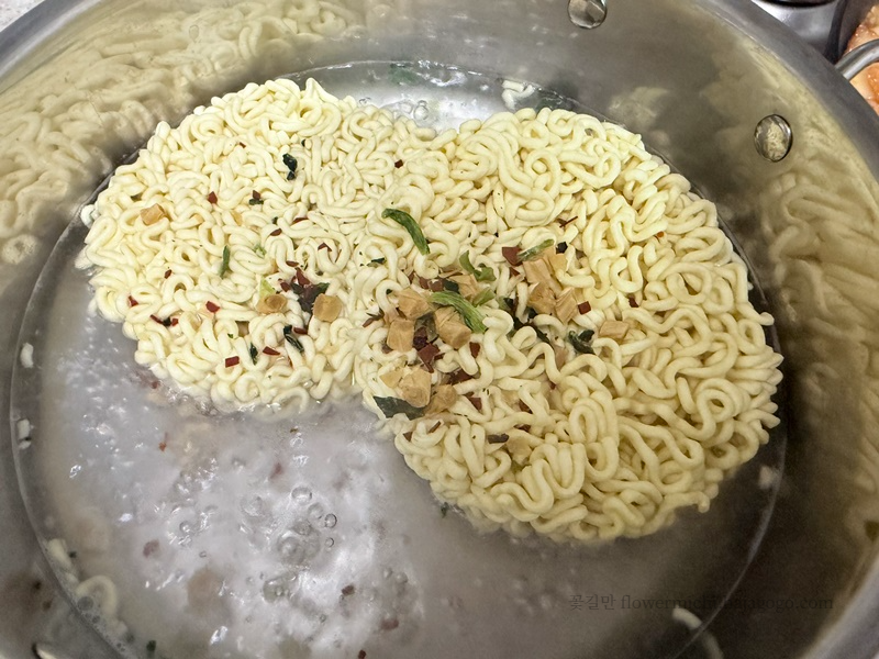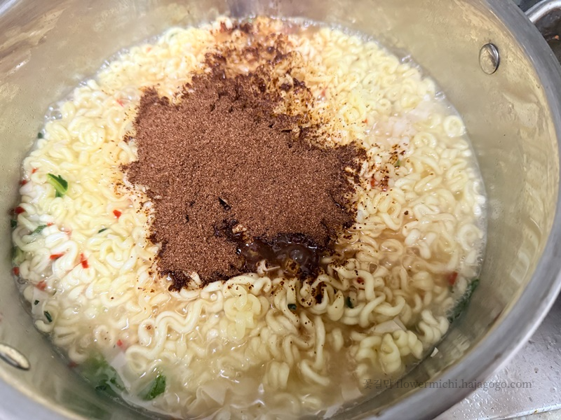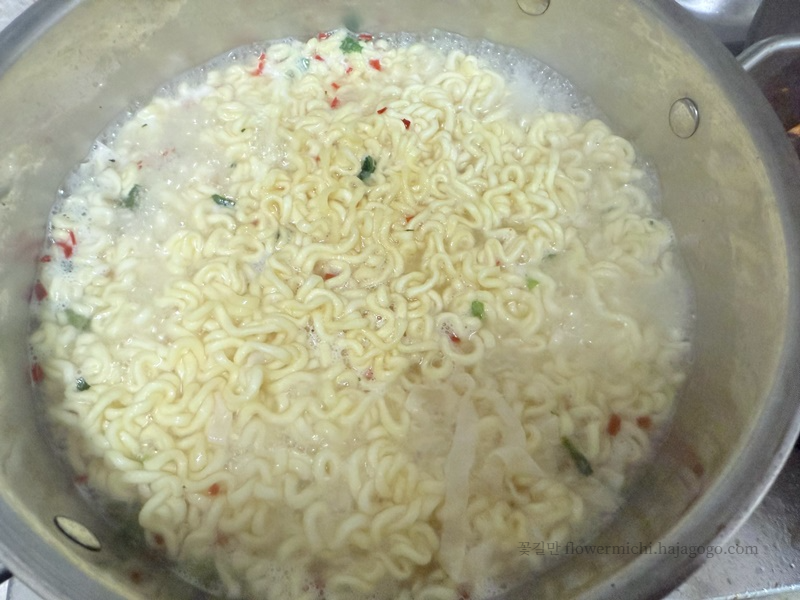 물이 끓을 때 면을 넣었는데요. 빨간색 무언가가 눈에 띕니다. 백퍼센트 이건 맵겠다는 느낌이 옵니다.