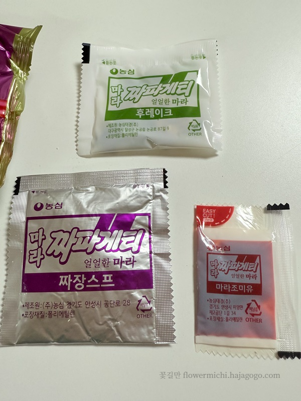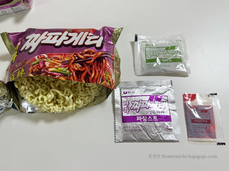 내용물을 살펴보자면 일반 짜파게티와 비슷합니다. 면이 들어 있고, 짜장스프, 후레이크, 조미유가 들어 있습니다. 다른 점이 있다면 조미유가 빨간색! 맵지 않을까 걱정이 되기 시작합니다. 그래도 처음 먹어 보는 것이니 재료는 덜어내지 않고 다 넣기로 합니다.