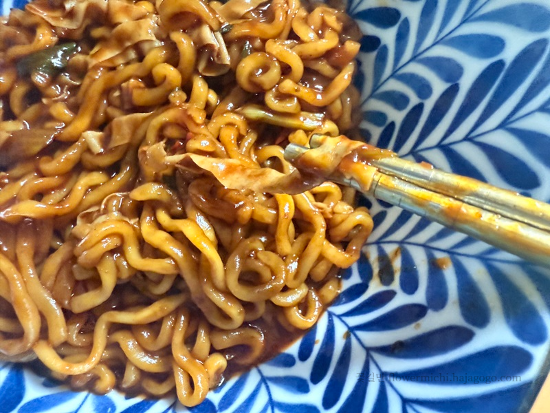 다 완성되고 그릇에 옮겨 담으니 일반 짜파게티와 비슷해 보입니다. 하지만 마라향이 확 나요. 안에 일반 면과 다른 게 들어 있는데, 뭔지 궁금해서 봉지를 다시 살펴보니 건두부피가 들어간 듯합니다. 그렇게 존재감이 크지는 않아요.